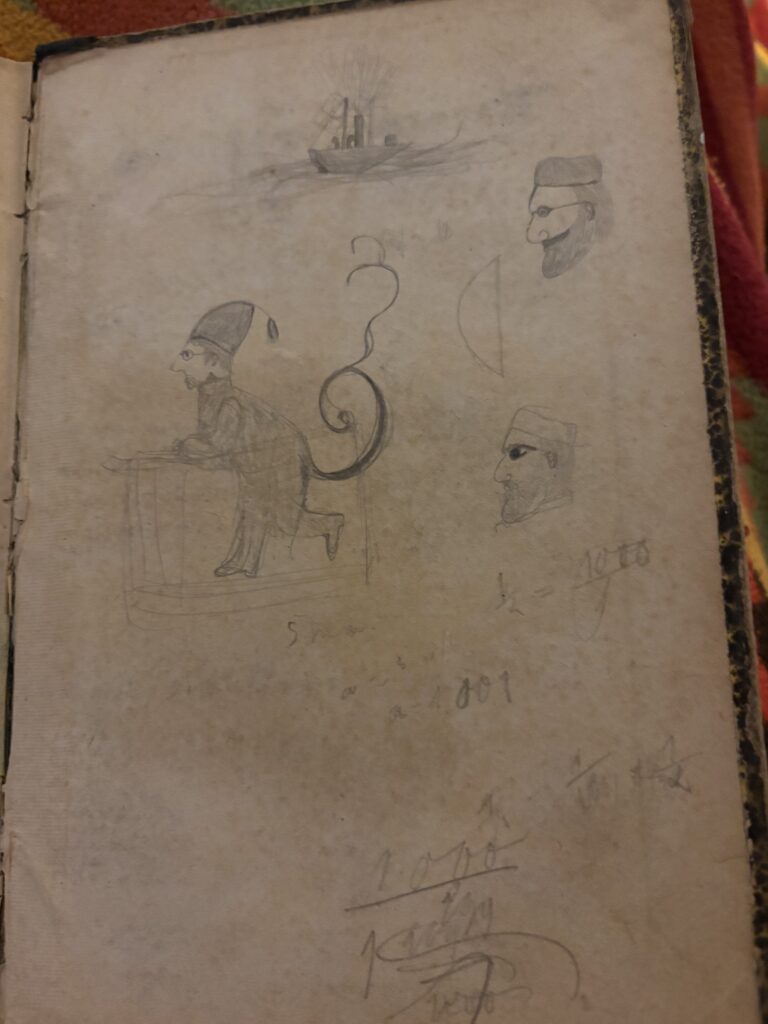 Die Schülerinnen und Schüler waren genauso frech und hatten genauso Langeweile wie wir. Und was macht man, wenn man nicht daddeln kann? Man zeichnet in sein Buch (habe ich früher auch gemacht, aber eher in den 80er/90ern …während des Deutschen Kaiserreichs war ich vom Physikunterricht ausgeschlossen und musste Kochen und Benehmen lernen…und wie man einen Ehemann bekommt…und ignoriert, wenn er Affären mit zwielichtigen Frauen hat….und wie man sich vor der Syphilis schützt…das magische Wort ist „Frauenprobleme“…